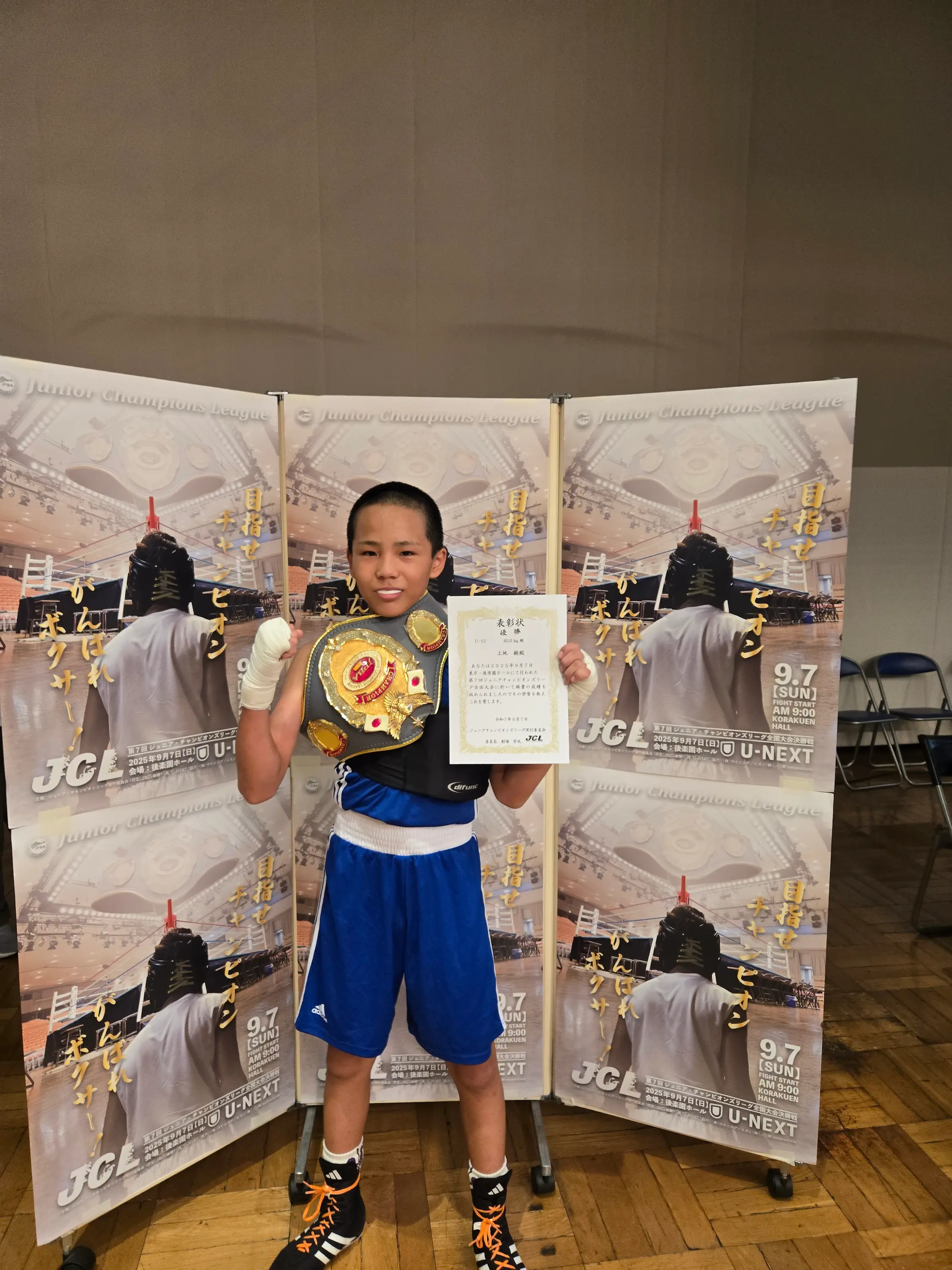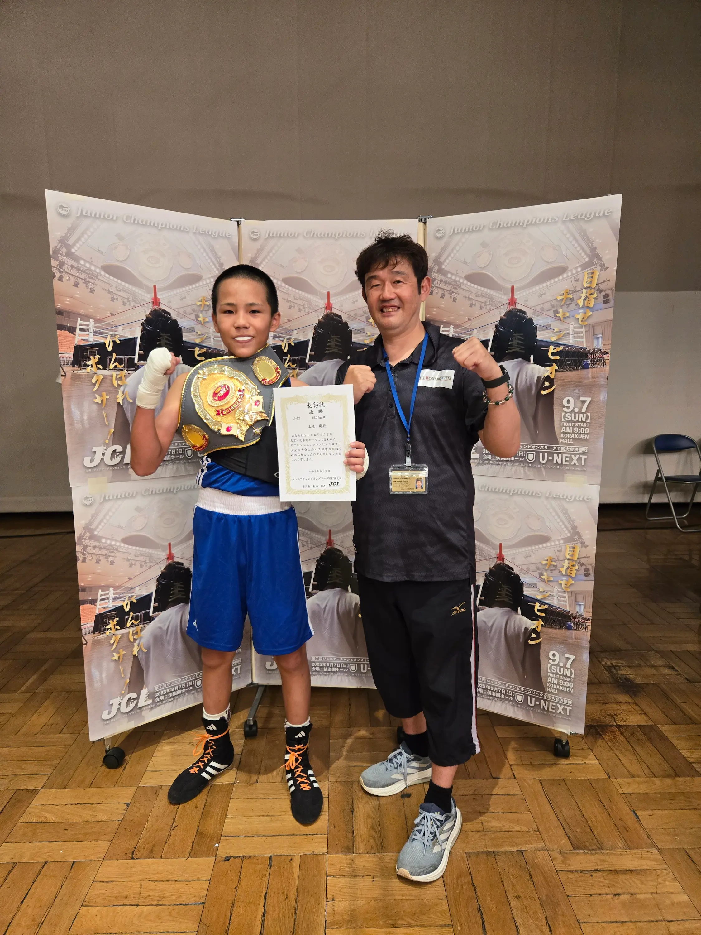 9月7日(日)後楽園ホールにて、ジムの上地君が、JCLチャンピオンリーグで日本チャンピオンになりました😃⤴️⤴️